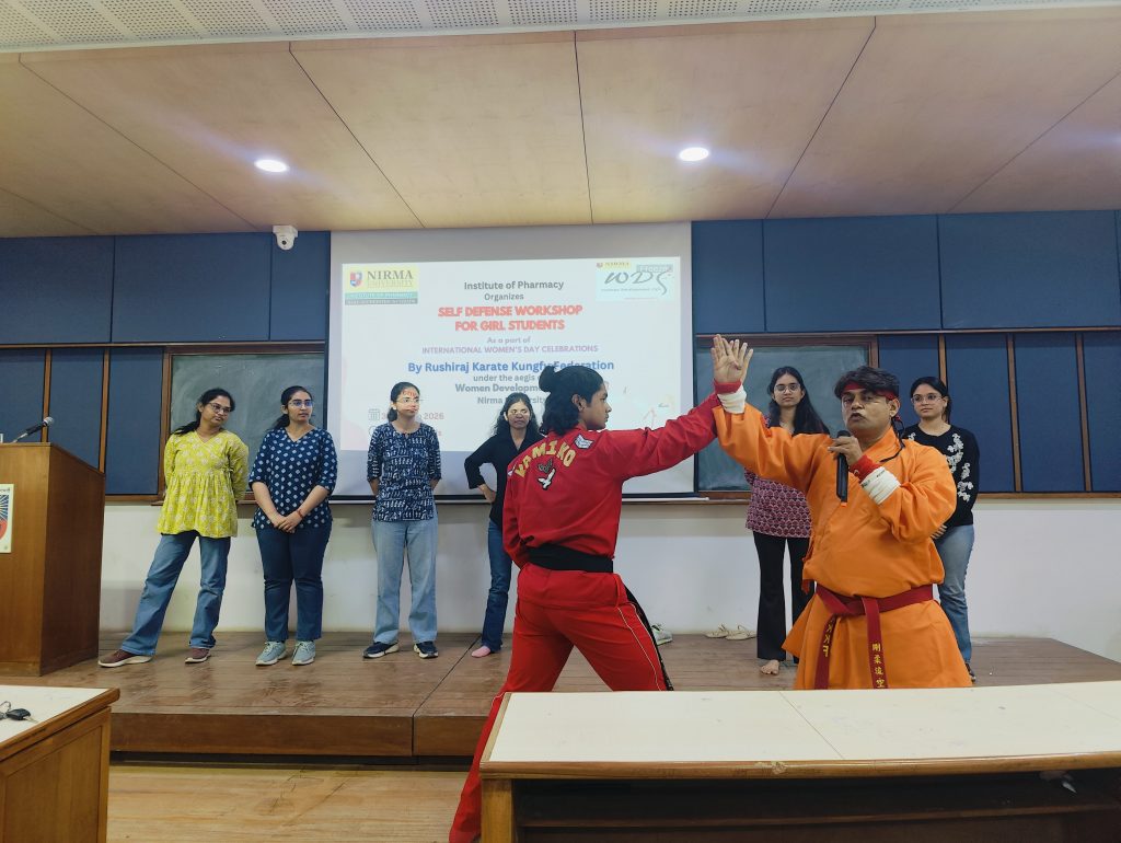 As part of the International Women’s Day Celebrations 2026, the Institute of Pharmacy, Nirma University organized a “Self-Defense Workshop” on 3rd March 2026 for girl students of B.Pharm Semester I, M.Pharm Semester II, and newly admitted Ph.D. scholars (2025 batch) under the aegis of the Women Development Cell (WDC), Nirma University.