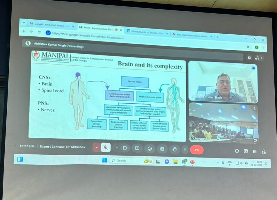 📢 The Institute of Pharmacy, Nirma University organized an expert lecture on “Mindfulness and the Science of Brain Health” on 26-02-2026 for B.Pharm and Pharm.D First-Year students.