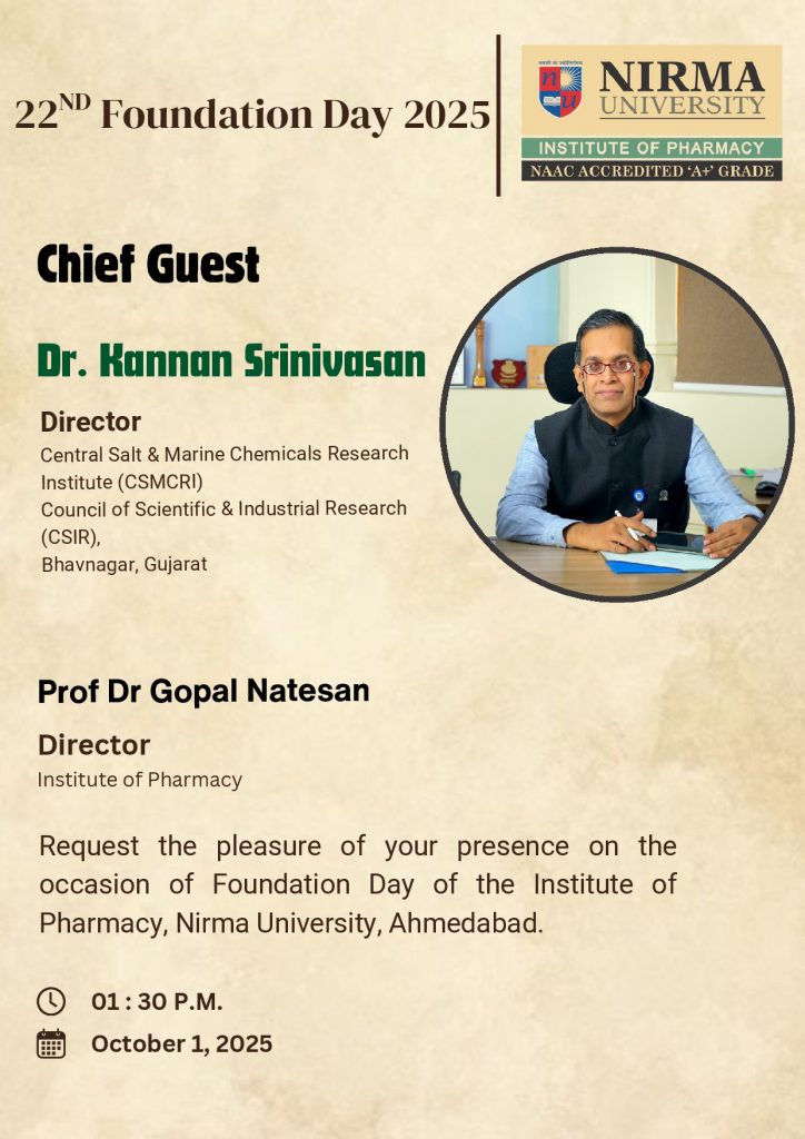 We are privileged to welcome our Chief Guest, Dr. Kannan Srinivasan, Director, CSMCRI–CSIR, Bhavnagar, and the event will be presided over by Dr. Anup K. Singh, Director General, Nirma University.