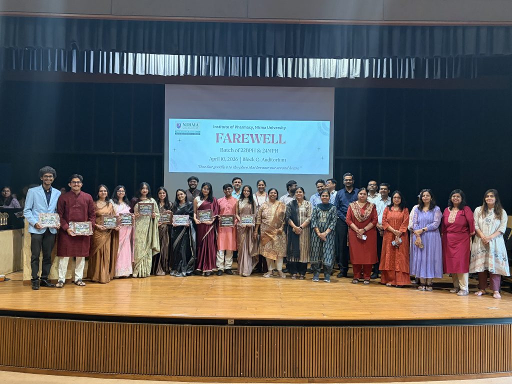 The Institute of Pharmacy, Nirma University, bid farewell to the outgoing B.Pharm (22BPH) and M.Pharm (24MPH) batches on 10 April 2026 with a heartfelt ceremony. Dr. Tejal Mehta, I/c Director, inspired students with her words of encouragement, followed by Dr. Udit Chaube, Class Coordinator, who shared fond memories. The event brimmed with nostalgia through open mic reflections, a documentary, and lighthearted memes. Mementos and NSS awards honored student achievements, while group photographs captured lasting bonds. The celebration concluded with High Tea, as the institute extended warm wishes for the graduates’ bright futures filled with success and happiness.